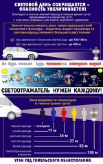 Осенью день стремительно исчезает, наступают сумерки и ночь, к темному времени суток прибавляются дожди и туман, которые ухудшают видимость на дороге и создают опасность для всех участников дорожного движения. Водителям сложнее отреагировать на внезапное возникновение препятствия, будь то пешеход, велосипедист, гужевая повозка или оставленное без габаритов транспортное средство. Статистика дорожно-транспортных происшествий по Гомельской области свидетельствует о том, что с уменьшением продолжительности светового дня, происходит увеличение количества наездов на пешеходов, велосипедистов, возчиков гужевого транспорта.